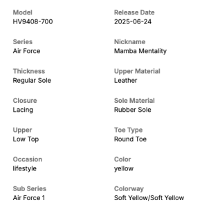 Celebrate Kobe’s legacy with the Nike Air Force 1 Low Protro “Soft Yellow.” Premium leather, purple accents, and a custom Kobe insole tell a story inspired by his iconic pajama game. ReactX cushioning provides modern comfort, while the “8” detail and checkered laces add unique touches.